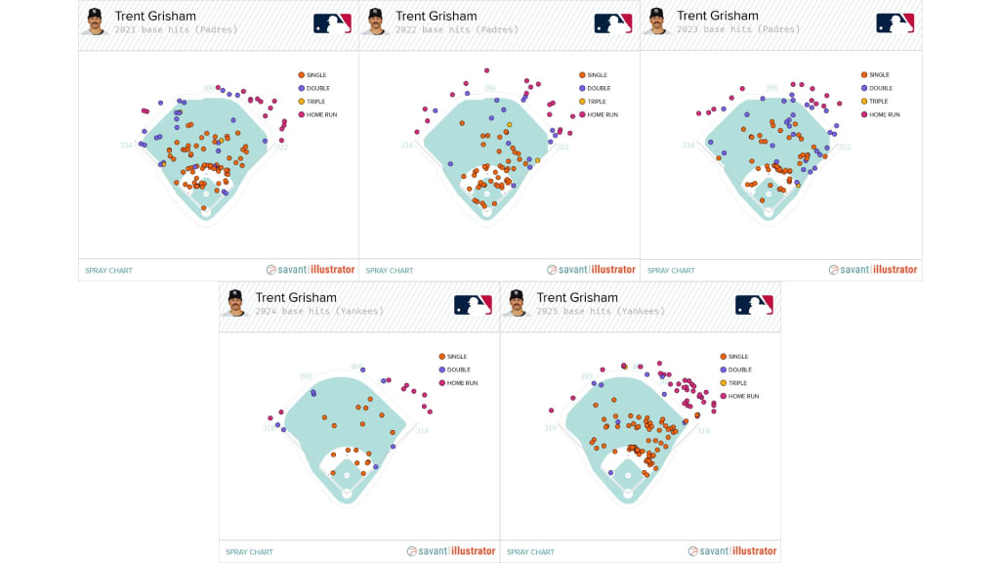 If there’s one adjustment that unlocked Grisham’s power, it’s this: he became a pull hitter in the air. Upon joining the Yankees, Grisham and the analytics staff clearly realized that his left handed swing and Yankee Stadium’s dimensions were a match made in heaven, if he tailored his approach to exploit them. The mantra: “pull the ball in the air.” Grisham had already been a ~60% fly-ball hitter most years, but previously those flies weren’t directed to maximize damage. That changed in 2025, as Grisham started yanking balls to right field with intent.
