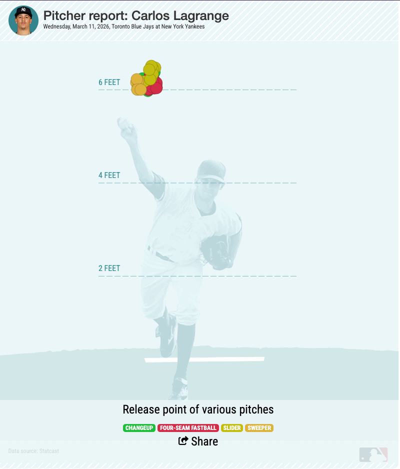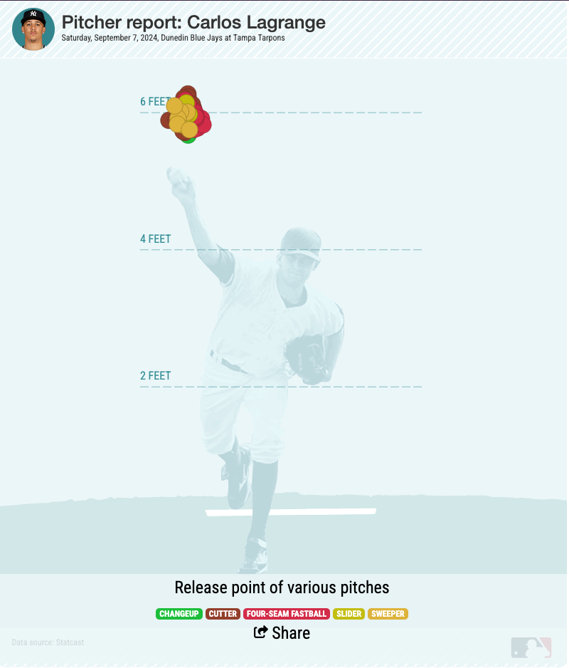 Lagrange has made significant strides in improving his pitch quality, plus a small uptick in velo since he was in Low-A Tampa in 2024. In some respects, comparing a season in Low-A to a Spring Training game is the most lateral comparison given both situations were on the same mound.