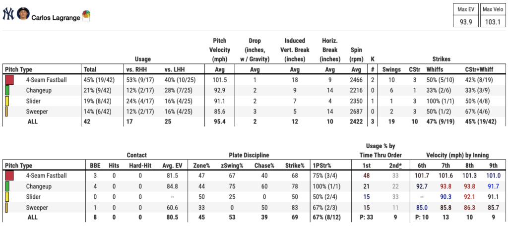 Righty flamethrower, Carlos Lagrange (top pitching prospect and #2 Yankees prospect per Pipeline), has been the talk of Tampa the past month and change, and for good reason. Lagrange averaged 101.5 MPH on his relief outing on Wednesday night, and has earned a 0.93 ERA over 9.2 IP (3 games), including a K/9 of 8.38 and a BB/9 of 2.79.