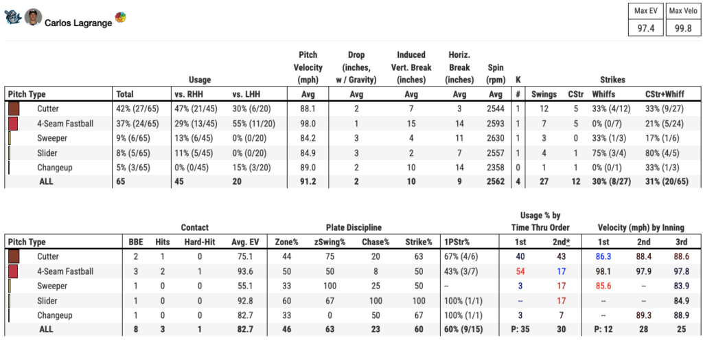 Looking at just this pitch data, Lagrange eliminated the cutter, which likely makes the change-up more effective. He still leans heavily on the four-seamer, but now mixes in the off-speed pitches a bit more, which induces more whiffs. In fact, his whiffs went up from 30% in 2024 to 47% in the most recent outing.